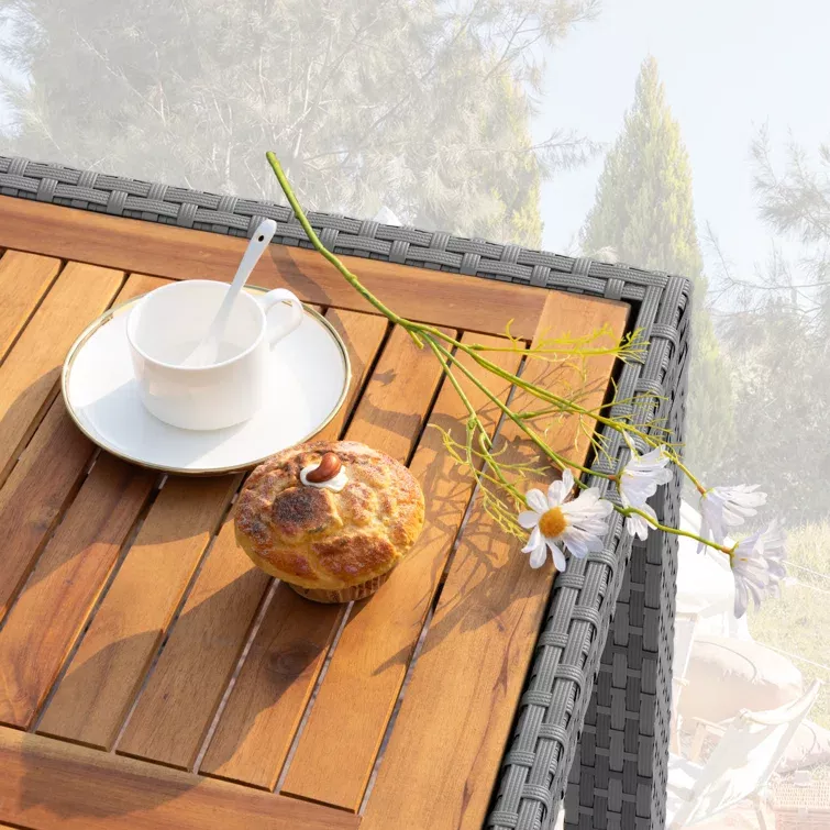 This outdoor dining set has transformed our backyard into a cozy oasis. It's not only functional but also incredibly stylish with its durable wicker construction and elegant Acacia wood tabletop. A perfect addition to any patio!